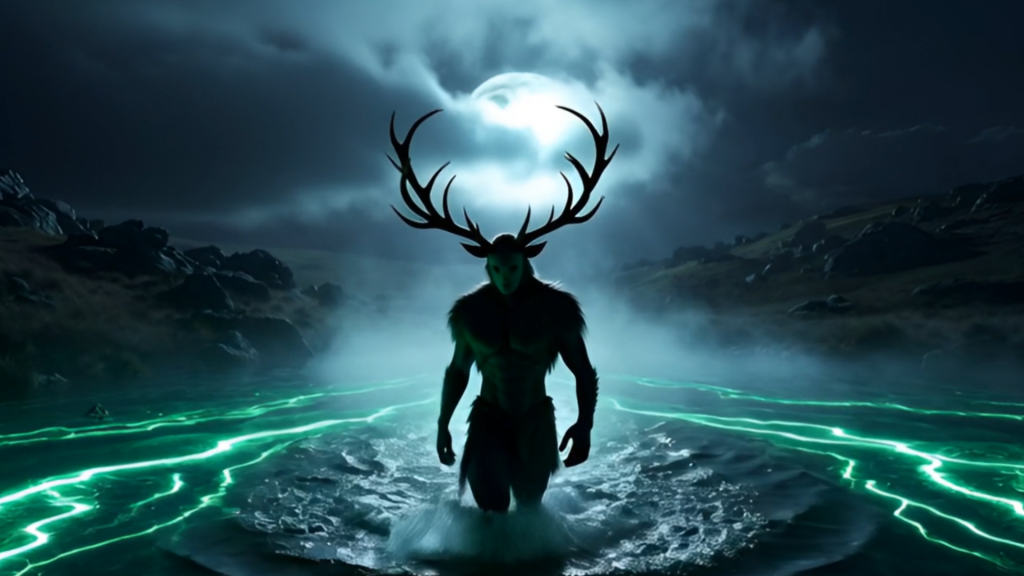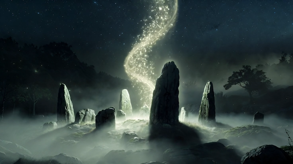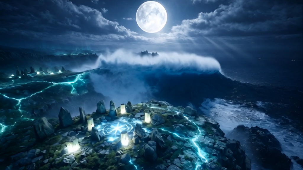 The color palette is dominated by deep night blues, silvery moonlight, muted blacks, and softly pulsing green-blue energy. The overall mood is mystical, ancient, cinematic, otherworldly, and reverent.